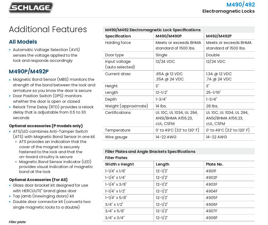M400 Series electromagnetic locks from Schlage are designed with the customer in mind to be robust, easy-to-install, and secure. The unique bayonet mounting feature makes installation easier, allowing the installer to have their hands free during the mounting process. All M400 Series electromagnetic locks are symmetrical with fieldselectable handing, allowing optimum placement of the magnet no matter the application. They are designed to provide automatic voltage sensing for 12 and 24 volts along with polarity protection to make wiring less complex. M490 models are tested and certified to meet or exceed UL 1034 and BHMA 1500 lb. hold force requirements. The M490 electromagnetic locks come in four configurations to meet your specific security needs. Single and double door models are offered in standard configurations. Plus versions of these models with “P” designations add intelligent sensing and reporting features needed to integrate with access control systems along with additional available options. Kits are also available for top jam, double door, and glass door applications.