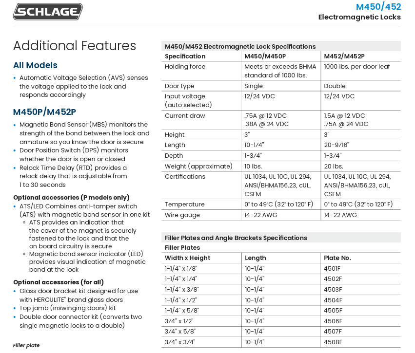 M400 Series electromagnetic locks from Schlage are designed with the customer in mind to be robust, easy-to-install, and secure. The unique bayonet mounting feature makes installation easier, allowing the installer to have their hands free during the mounting process. All M400 Series electromagnetic locks are symmetrical with fieldselectable handing, allowing optimum placement of the magnet, no matter the application. They are designed to provide automatic voltage sensing for 12 and 24 volts along with polarity protection to make wiring less complex. M450 models are tested and certified to meet or exceed UL 1034 and BHMA 1000 lb hold force requirements. The M450 electromagnetic locks come in four configurations to meet your specific security needs. Single and double door models are offered in standard configurations. Plus versions of these models with “P” designations add intelligent sensing and reporting features needed to integrate with access control systems along with additional available options. Kits are also available for top jam, double door, and glass door applications.