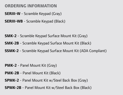 • Very narrow viewing angle of the lighted, scrambled digits • The membrane keypad is extremely durable • Random allocation of digits ensures even wear to the keys • Individual PIN codes can be up to 9 digits in length • The SERlll has a weatherproof rating of IP65 • An audible alarm signals when a button is depressed • Robust polycarbonate enclosure • The unit is equipped with power-up diagnostics and self-test routine • The SERlll is provided with Wiegand communication protocol • Over 3.6 million unique permutations are available • Terminal connection on the rear of the unit.