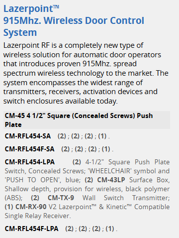 Lazerpoint RF„ is a completely new wireless solution for automatic door operators. The system introduces the many advantages of 915MHz spread-spectrum wireless technology to the automatic door market and encompasses the widest range of transmitters, receivers, activation devices and switch enclosures available today.