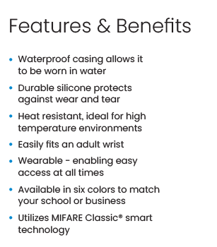Smart wristband credentials from Schlage® combine a smart solution with a wearable format. This credential offers convenience and secure access in a waterproof, silicone wristband, available in six colors. The smart wristband uses MIFARE Classic® technology with securely encrypted data, which is verified by both the credential and the reader, operates with