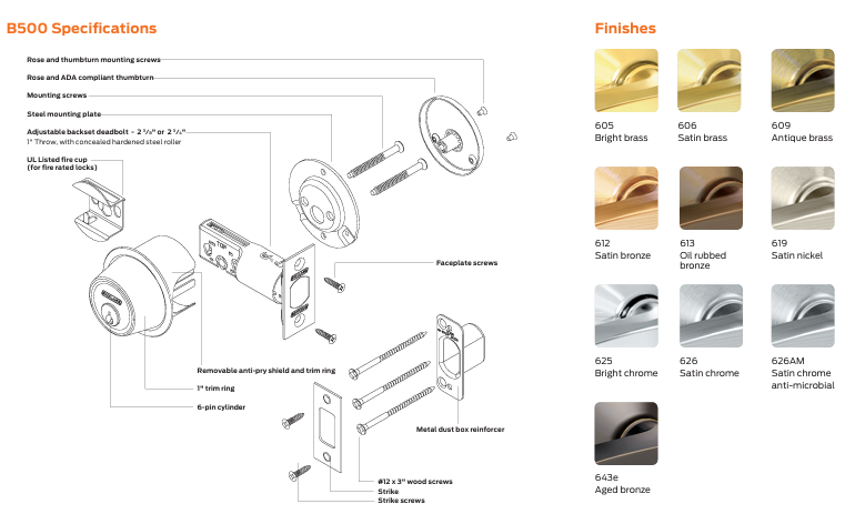 Offered in 7 functions and made to last, B500 deadbolts feature optional fire-rating and status indication. The metal dust box anchors into the door frame using 3 in. screws and are orderable in any Schlage® cylinder format. Top-selling Schlage® grade 2 B Series deadbolts rival many competitive grade 1 products for strength, durability and versatility. These mid-price point deadbolts are offered in 10 finishes, 7 functions and 3 cylinder formats. Their design includes anti-saw, anti-pry, anti-wrench and other security features not common to grade 2 deadbolts. They are easy-to-install and can meet any security need.