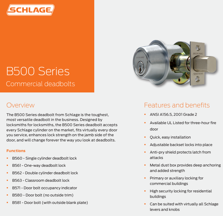 Offered in 7 functions and made to last, B500 deadbolts feature optional fire-rating and status indication. The metal dust box anchors into the door frame using 3 in. screws and are orderable in any Schlage® cylinder format. Top-selling Schlage® grade 2 B Series deadbolts rival many competitive grade 1 products for strength, durability and versatility. These mid-price point deadbolts are offered in 10 finishes, 7 functions and 3 cylinder formats. Their design includes anti-saw, anti-pry, anti-wrench and other security features not common to grade 2 deadbolts. They are easy-to-install and can meet any security need.
