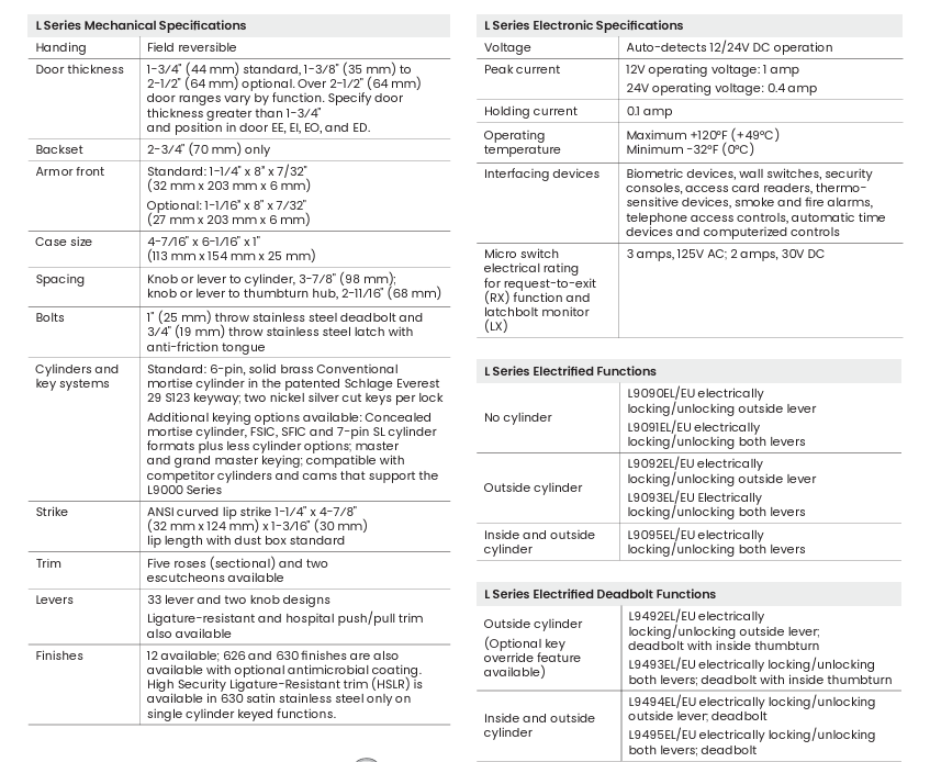 Many of the most advanced electronic access systems still rely on the strength and functionality of the mechanical lock hardware on the door. L Series electrified mortise locks include Schlage’s most diverse aesthetic options in a design built for performance, security and durability. It can be used as part of an integrated system or as a standalone solution with a buzzer or other device as the controller. The L Series offers exceptional flexibility and power savings. The lock automatically adapts to 12V or 24V DC input, and a case-mounted switch allows selection between EL and EU operation. Request-to-exit is modular and can be added without opening the lock case. 0.4 amp maximum current draw (24V operating voltage) allows multiple units on a single power supply, while 0.1 amp holding current eliminates “hot levers” in EL applications. Utilizing the same levers, trims and options as the mechanical Schlage L Series mortise, it suites seamlessly with the other L Series hardware which includes both purely mechanical and fully electronic solutions. And because it is based on the Schlage L mortise, it carries the same proven record of performance, strength and durability from the most trusted name in the industry.