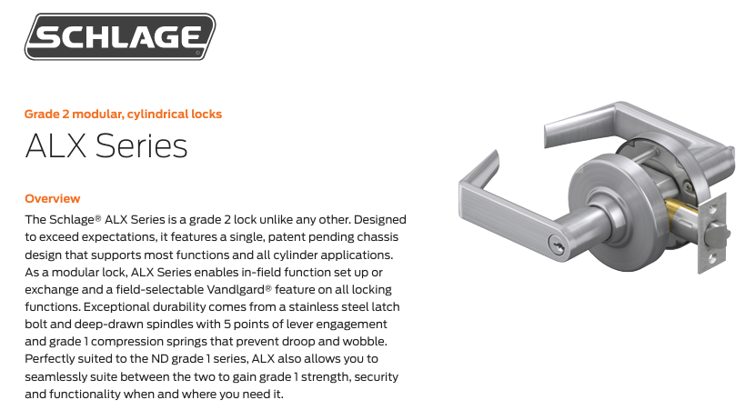 The Schlage® ALX Series is a grade 2 lock unlike any other. Designed to exceed expectations, it features a single, patent pending chassis design that supports most functions and all cylinder applications. As a modular lock, ALX Series enables in-field function set-up or exchange plus a field-selectable Vandlgard® feature on all locking functions. Exceptional durability comes from a stainless steel latchbolt, deep-drawn spindles with 5-points of lever engagement and the use of grade 1 compression springs that prevent droop and wobble. Perfectly suited to the ND Series grade 1 locks, ALX allows you to seamlessly suite between the two to gain grade 1 strength, security and functionality when and where you need it right alongside ALX as a budget saving grade 2 solution elsewhere in the building.